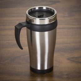 Caneca inox 400 ml com pegador e parte inferior plástica colorida. Tampa rosqueável, possui compartimento que pode ser aberto para beber(não é térmica).