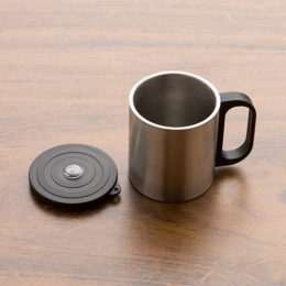 Caneca de inox 200ml com cabo e tampa em plástico resistente, possui uma bússola na parte central da tampa (não é térmica).