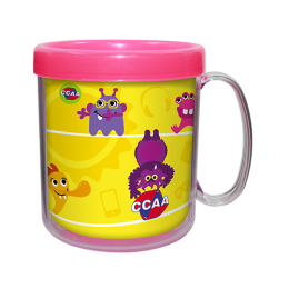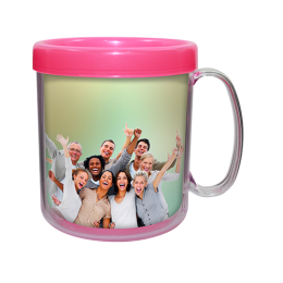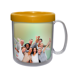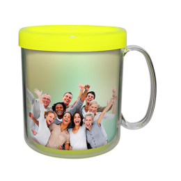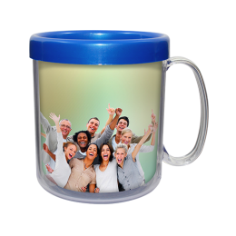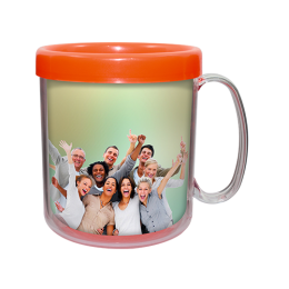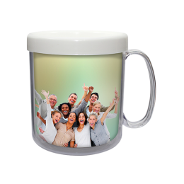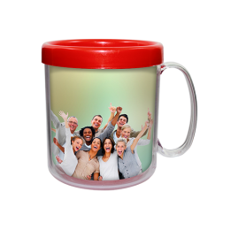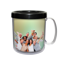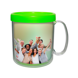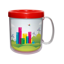 Capacidade para 300ml. Caneca plástica, atóxica, composta por três partes, um corpo cristal transparente em Plástico Premium (PS Cristal), um refil colorido em Plástico Premium (PP) e um refil de papel com impressão digital colorida. Dupla parede que conserva por mais tempo a temperatura.