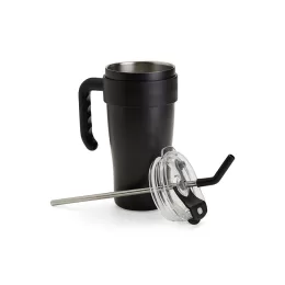 Descrição: Caneca térmica em inox com capacidade máxima de 800ml. Possui estrutura em parede dupla, alça ergonômica em plástico, tampa rosqueável com vedação a vácuo, protetor para bocal e acesso para canudo com tampa em silicone. Acompanha canudo de inox com ponta de silicone removível.