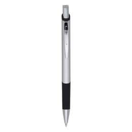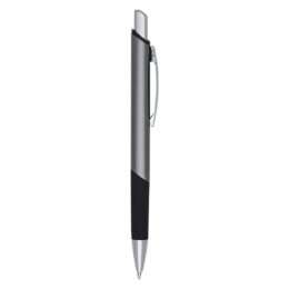 Caneta metal quadrangular, corpo colorido com pintura brilhante metalizada e detalhe emborracha preto na parte inferior. Clip de metal, aciona por clique.