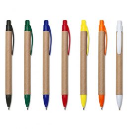 Descrição: Caneta ecológica de papelão com detalhes coloridos, o clip pode facilmente ser retirado para personalização no corpo da caneta. Clip e ponteira plástica, aciona por clique.