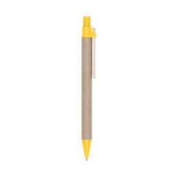Caneta ecológica de papelão com detalhes coloridos. Clip de madeira e ponteira plástica, possui relevo na ponteira. Aciona por clique.