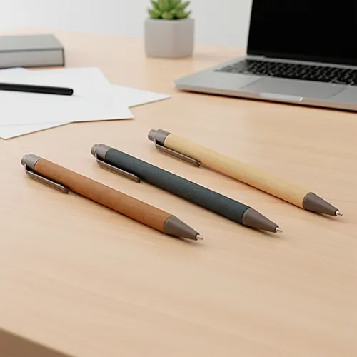 Caneta com corpo em papelão, ponteira e clip em plástico ABS, com acionamento por clique e carga esferográfica azul de 1,0mm.