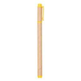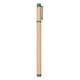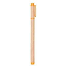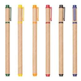 Caneta Ecológica Roller. Caneta de material kraft com tampa, possui clip plástico colorido, anel e parte inferior plástica colorida.