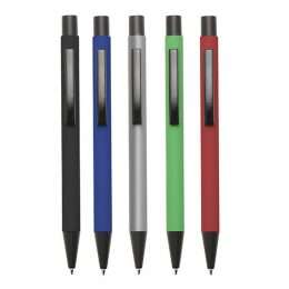 Descrição: Caneta metal com pintura fosca colorida, acionador, clip e ponteira na cor preta. Aciona por clique.
