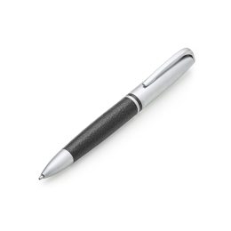Descrição: Caneta metálica com acabamento fosco e detalhe em couro sintético. Clipe metálico com a parte superior colorida e anel central preto. Carga esferográfica azul e acionamento por rotação.