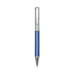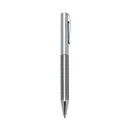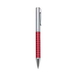 Caneta metal prata com detalhes coloridos e quadriculados. Clip metal com anel superior na ponta e dois anéis centrais. Aciona por giro.