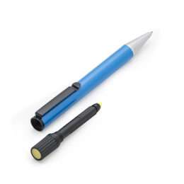 Caneta metal inteira colorida com marca texto. Clip de metal preto, para utilizar o marca texto basta desrosquear a tampa superior(possui relevo e detalhe amarelo na ponta). Esferográfica aciona segurando a ponteira e girando a caneta.