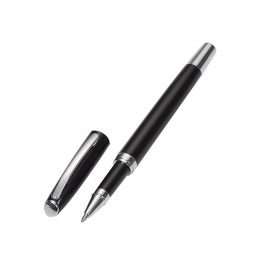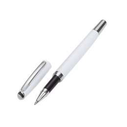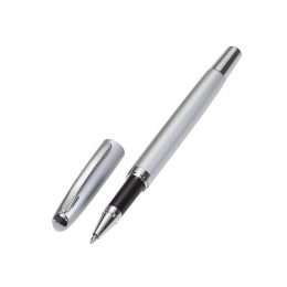 Descrição: Caneta metal roller com tampa, inteira colorida e detalhes em prata. Clip(metal) e parte superior em prata, possui anel e parte inferior também prateado.