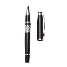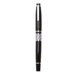 Descrição: Caneta metal roller preto com detalhes em prata. Clip e anel superior prata, possui detalhe prata texturizado no centro e anel inferior prata. Basta puxar a tampa para utilização.