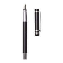 Descrição: Caneta metal tinteiro preta com detalhes prata. Clip metal prata com anel superior e 4 anéis centrais. Parte interna com “seringa” para filtrar tinta da carga de “garrafa”. Caso tenha o cartucho de tinta não é necessário utilizar a seringa, basta colocar o cartucho no lugar.