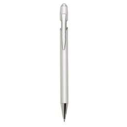 Descrição: Caneta metal com ponteira touch. Corpo com pintura prata fosco, acionador com borracha touch e clip metálico com detalhe brilhante. Aciona por clique.