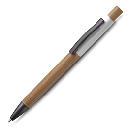 Caneta esferográfica em alumínio reciclável com escrita em azul. Refil parker e acionador e corpo em bambu.