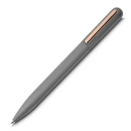 Caneta esferográfica em alumínio e clip em latão reciclável com escrita em azul.