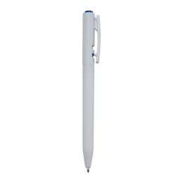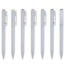 Descrição: Caneta plástica branca com detalhes coloridos. Anel central e acionador em relevo. Aciona por clique e para destravar basta apertar a parte inferior do clip.