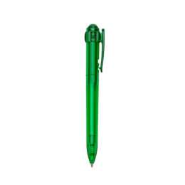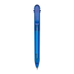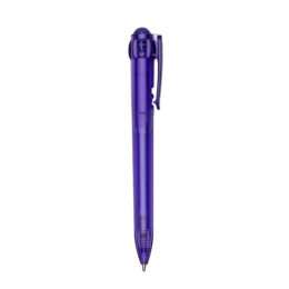 Caneta plástica inteira colorida com acionador em relevo. Suporte do clip com dois furos em cada lateral e detalhe em relevo, possui anel “vazado” abaixo do clip e detalhes na parte inferior em relevo. Aciona por clique e destrava apertando a parte inferior do clip.