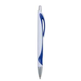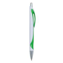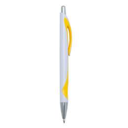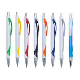 Caneta Plástica 13781 branca com detalhe colorido. Clip plástico com acionador e ponteira prata, aciona por clique.