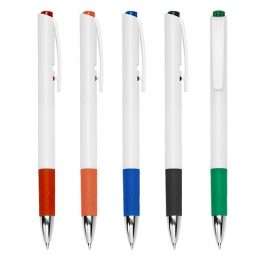 Descrição: Caneta plástica de corpo branco e detalhes emborrachado. Acionador plástico colorido, aciona por clique e é destravado pressionando a parte inferior do clip.