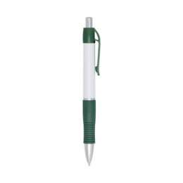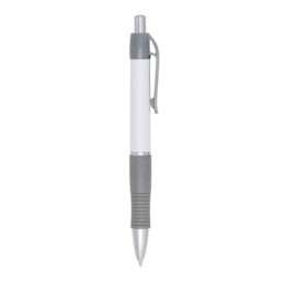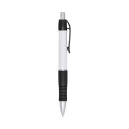 Caneta plástica branca com detalhes coloridos. Possui clip plástico colorido, possui anel central prata e parte inferior emborrachada colorida com relevo . Aciona por clique.