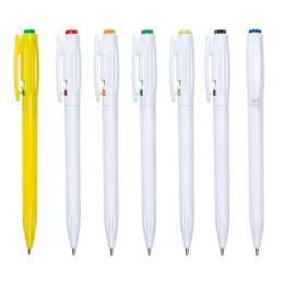 Descrição: Caneta plástica branca com detalhe colorido. Possui detalhes em relevo na parte superior ao redor do clip, parte inferior com detalhes em relevo. Aciona por clique e para destravar basta apertar a parte inferior do clip.