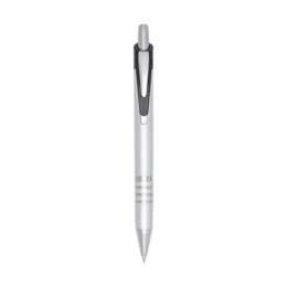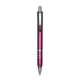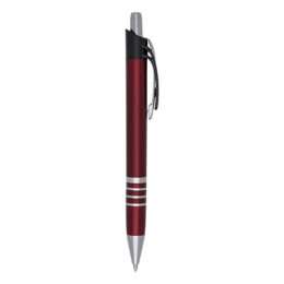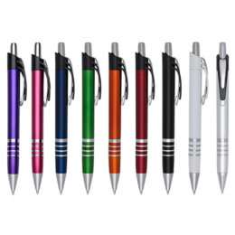 Caneta plástica inteira colorida com detalhes prata. Possui clip de metal com detalhe plástico preto, parte inferior com três anéis coloridos. Aciona por clique.
