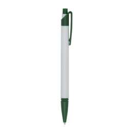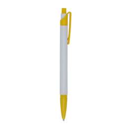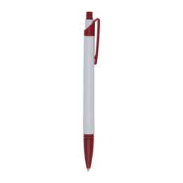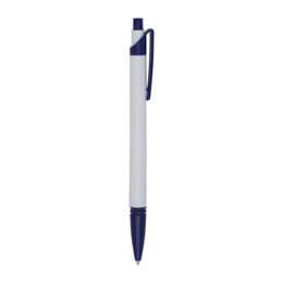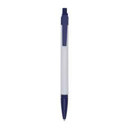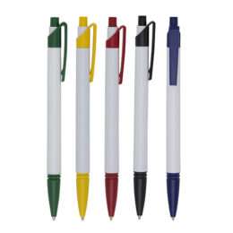 Caneta plástica corpo branco com detalhes coloridos. Possui relevo na ponteira, aciona por clique.