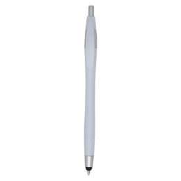 Caneta plástica com ponteira touch, inteira colorida com detalhes prata. Aciona por clique, ponteira sai através da borracha touch.