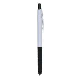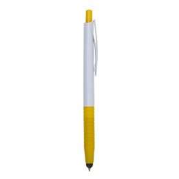 Descrição: Caneta plástica touch de corpo branco com detalhes coloridos. Borracha touch inferior, clip plástico com detalhe vazado nas laterais, acionador e parte inferior colorida com oito anéis em relevo. Aciona por clique.