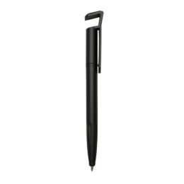 Caneta plástica touch com suporte para celular, caneta inteira colorida com detalhes preto. Clip plástico aberto utilizado como suporte para o celular e parte superior com limpador de tela, possui anel preto abaixo do clip e parte inferior com detalhes em relevo. Aciona por giro.