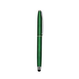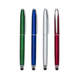 Caneta plástica touch inteira colorida com detalhes em prata. Possui tampa e clip de metal, anéis: superior, central e inferior em prata. Para utilizar esferográfica basta tirar a tampa, touch fica do lado oposto.