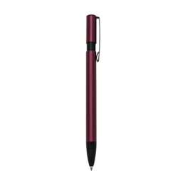 Caneta semi metal inteira colorida com clip metal e “suporte” preto. Possui uma espécie de anel na ponteira. Aciona por clique.