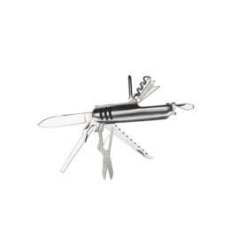 Canivete metal 11 funções com detalhes emborrachados preto(três linhas frente e verso). Possui: lâmina de corte, serrilha, serra madeira, mini tesoura, abridor de latas, abridor de garrafa, chave phillips, lamina de remoção e limpeza, lixa, agulha de sutura e saca rolhas. Acompanha bainha em nylon.