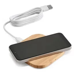 Carregador wireless. Bambu. Input: 5V/2A. Potência máxima de carregamento de 5W. Incluso cabo USB/micro USB de 1 m para carregar. Compatível com smartphones com tecnologia de carregamento sem fios. 92 x 92 x 9 mm