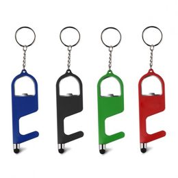 Descrição: Chaveiro plástico de material antibacteriano com funções de abridor de garrafa, touch screen e aciona superfícies sem o contato físico.