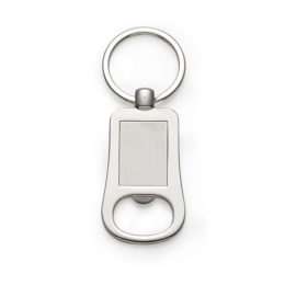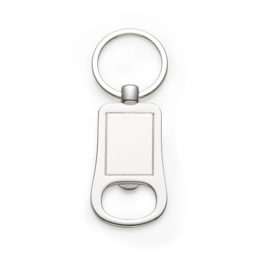 Chaveiro de metal abridor, possui chapa central para personalização na frente e verso apenas com o desenho quadrangular, porém liso.