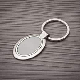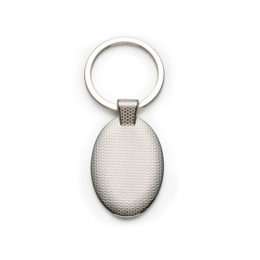Chaveiro metal oval com chapa grafite espelhada, possui parte inferior com relevo e suporte da argola também em relevo.