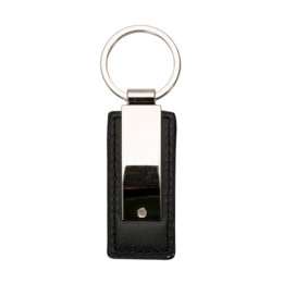 Chaveiro metal brilhante com detalhe em couro sintético colorido, verso com detalhe do parafuso e frente lisa.