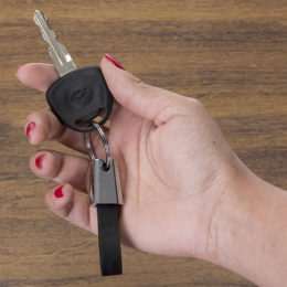 Chaveiro e metal com alça de couro sintético, frente lisa e verso com detalhe do parafuso.