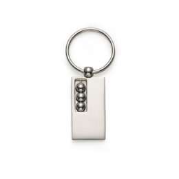 Chaveiro metal retangular fosco com três esferas brilhantes no canto superior, suporte do chaveiro giratório.