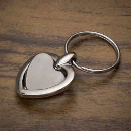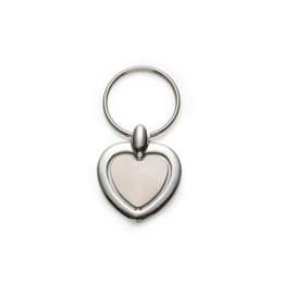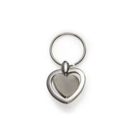 Chaveiro metal giratório formato coração, possui chapa central de coração com ambos lados lisos.