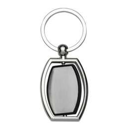 Chaveiro metal giratório. Possui suporte redondo giratório que segura o chaveiro, chapa giratória ambos lados iguais e com contorno preto.