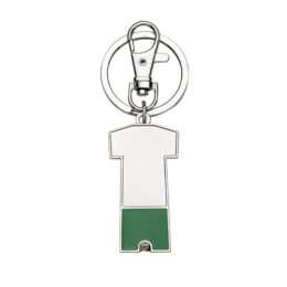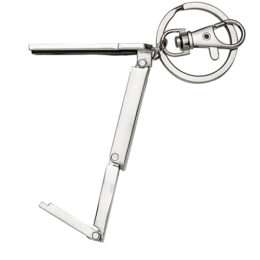 Chaveiro metal porta bolsa dobrável formato uniforme. Parte traseira com borracha anti deslizante, possui além do chaveiro um gancho prendedor. Para utilizar o porta bolsa basta puxar o compartimento traseiro(é imantado) e abri-lo.