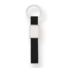 Chaveiro Metal 13850 quadrado com alça emborrachada e detalhes de costura. Possui chapa frontal em metal e verso liso com detalhe dos parafusos.