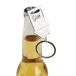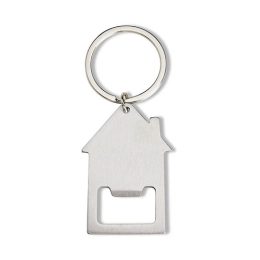 Descrição: Chaveiro abridor metálico formato casa.