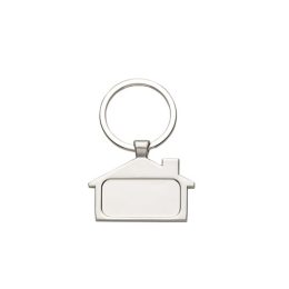 Descrição: Chaveiro metal fosco formato casa. Parte frontal com desenho em relevo das janelas e portas, verso com um retângulo no centro ideal para personalização.