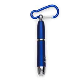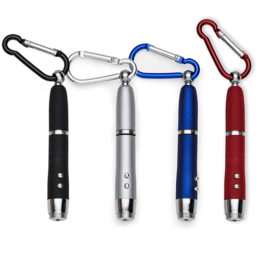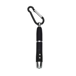 Mini caneta metal multifunção. Possui laser, lanterna e uma caneta esferográfica que pode ser utilizada desrosqueando a tampa que tem um mosquetão. Acompanha três baterias LR44.