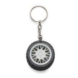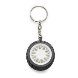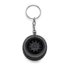 Chaveiro plástico formato pneu, aro detalhado plástico colorido de um lado e lado inverso liso (possível aplicar resina). Pneu emborrachado.