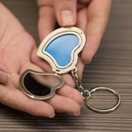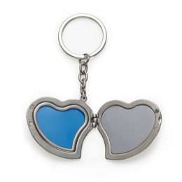 Chaveiro Porta Foto Coração. Parte externa frontal brilhante e verso fosco(ambos lados lisos), parte interna com suporte para foto(basta tirar encaixe “tampa” interno) e um dos lados com espelho. Possui imã para abrir/fechar.