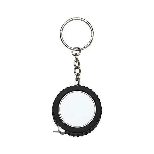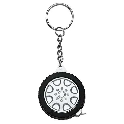 Chaveiro trena 1 metro formato pneu fosco, material emborrachado com relevo. Detalhes do aro em plástico prata, verso liso. Trena não possui trava.